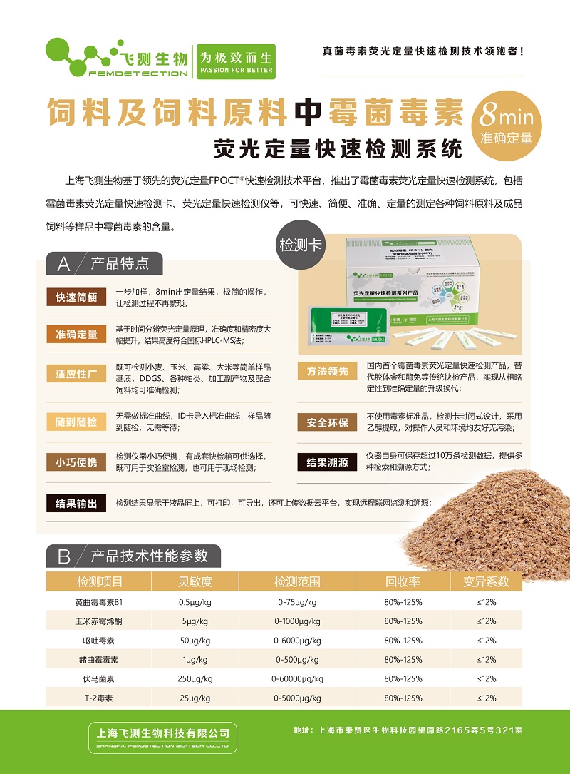 上海飛測飼料原料及配合飼料中玉米赤霉烯酮檢測卡采用熒光定量快速檢測原理,利用熒光微球標記抗體的層析作用,待測標記物與熒光微球標記抗體結合后,采用熒光讀數儀的讀取T線和C線的熒光強度并計算T/C值,通過儀器內置的標準曲線即可計算出樣品中待測物的含量。