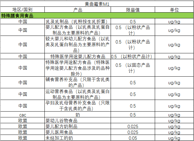 三 、黃曲霉素B1 和 黃曲霉素M1 增加了特殊醫(yī)學用途配方食品、輔食營養(yǎng)補充品、運動營養(yǎng)食品、孕婦及乳母營養(yǎng)補充食品中的限量要求。