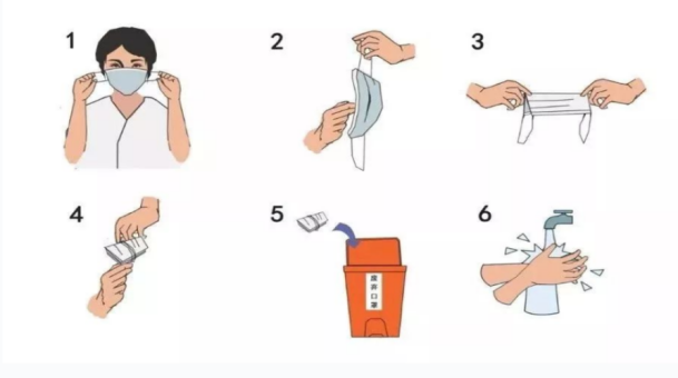 答:手不要接觸口罩對外的一面;如果是系帶的口罩,要先解開下面的帶子,再解開上面的帶子;用手指捏到口罩的帶子或者掛耳的帶子丟到垃圾桶;丟掉口罩后要洗手。