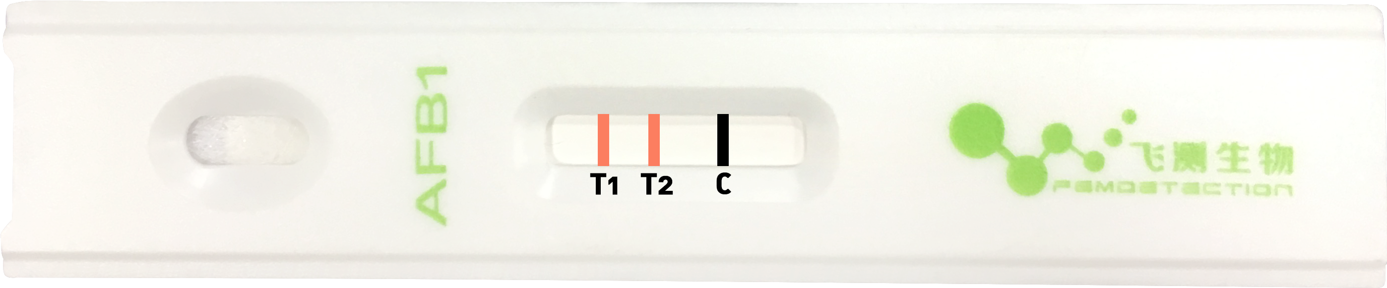 當將樣品滴加在加樣區時,樣品中的待測物與結合墊中的熒光微球標記抗體結合并通過毛細作用向前層析,當 達到檢測區后,檢測線T線上固定的抗原與剩余的部分熒光微球標記抗體結合,檢測線T線上結合的熒光微球標記抗體的量與樣品中待測物的量成反比,質控線C線結合的熒光標記物樣品中待測物的量無關,其它熒光標記物繼續層析達到吸收區。層析結束后,采用熒光讀數儀的讀取T線和C線的熒光強度并計算T/C值,通過便攜式霉菌毒素檢測儀內置的標準曲線即可計算出 樣品中待測物的含量。