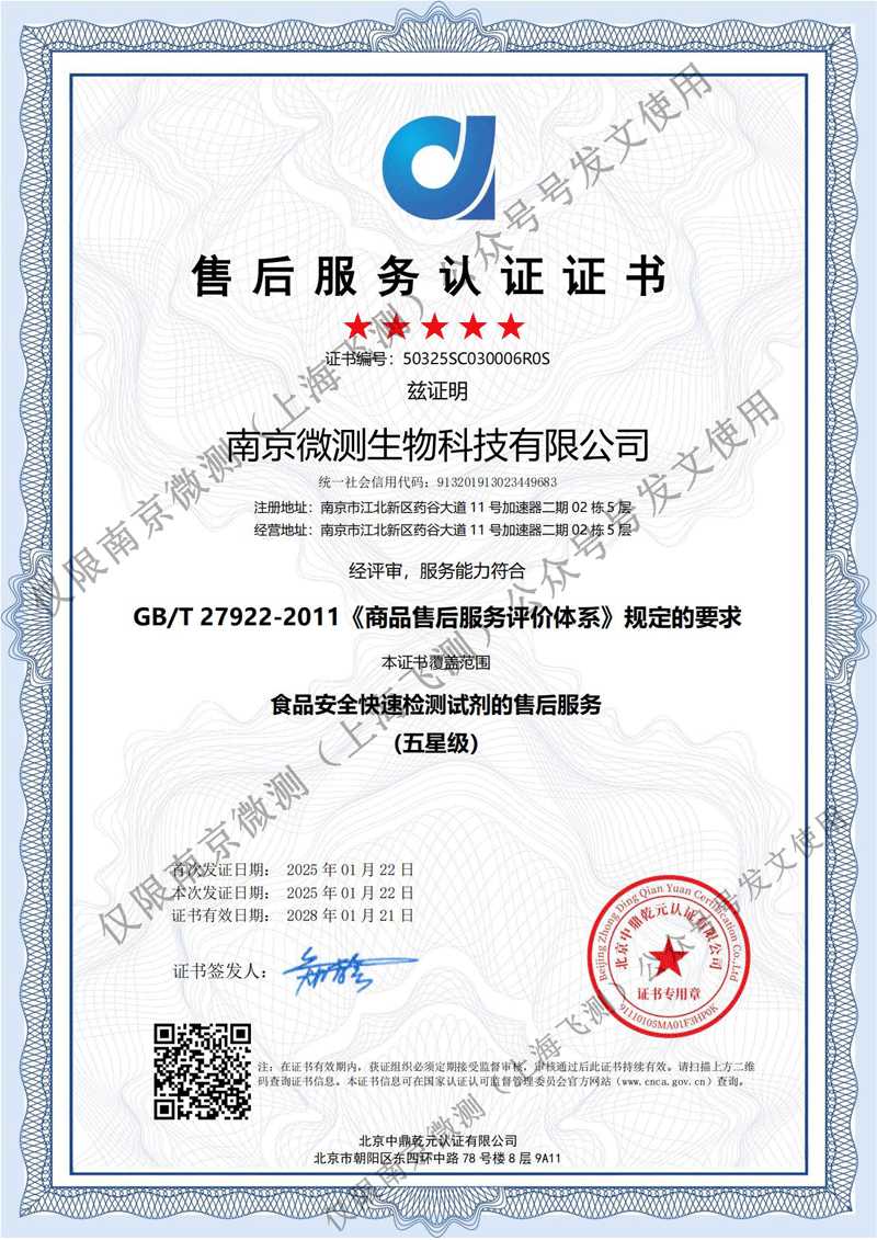 親愛的朋友們,今天,我們非常榮幸地宣布,南京微測生物科技有限公司正式通過了五星售后服務(wù)體系認(rèn)證(國家標(biāo)準(zhǔn)GB/T 27922-2011)!這不僅是對(duì)我們服務(wù)能力和質(zhì)量的權(quán)威認(rèn)可,更是我們對(duì)客戶承諾的堅(jiān)實(shí)保障。
