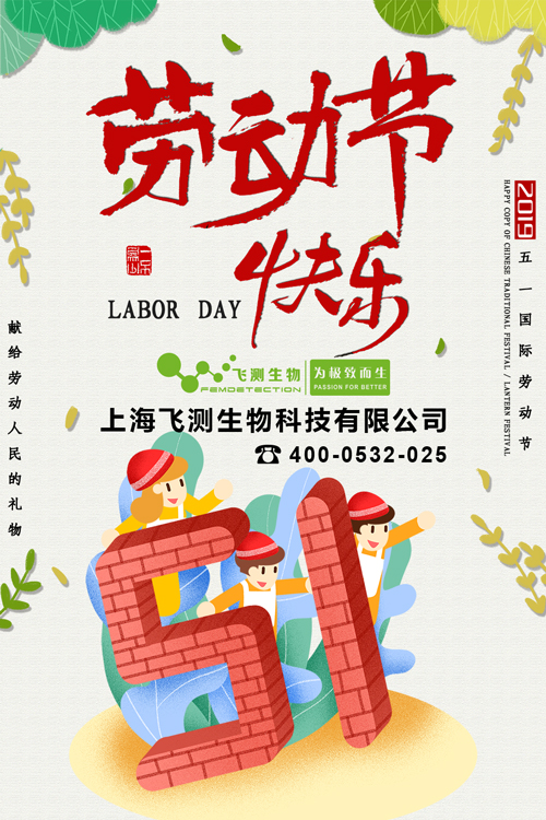 上海飛測生物科技有限公司祝新老客戶朋友五一勞動節快樂!友情提示:2019年5月1日起至2019年5月4日放假,共計4天,放假期間不發貨,5月5日上班恢復正常發貨。