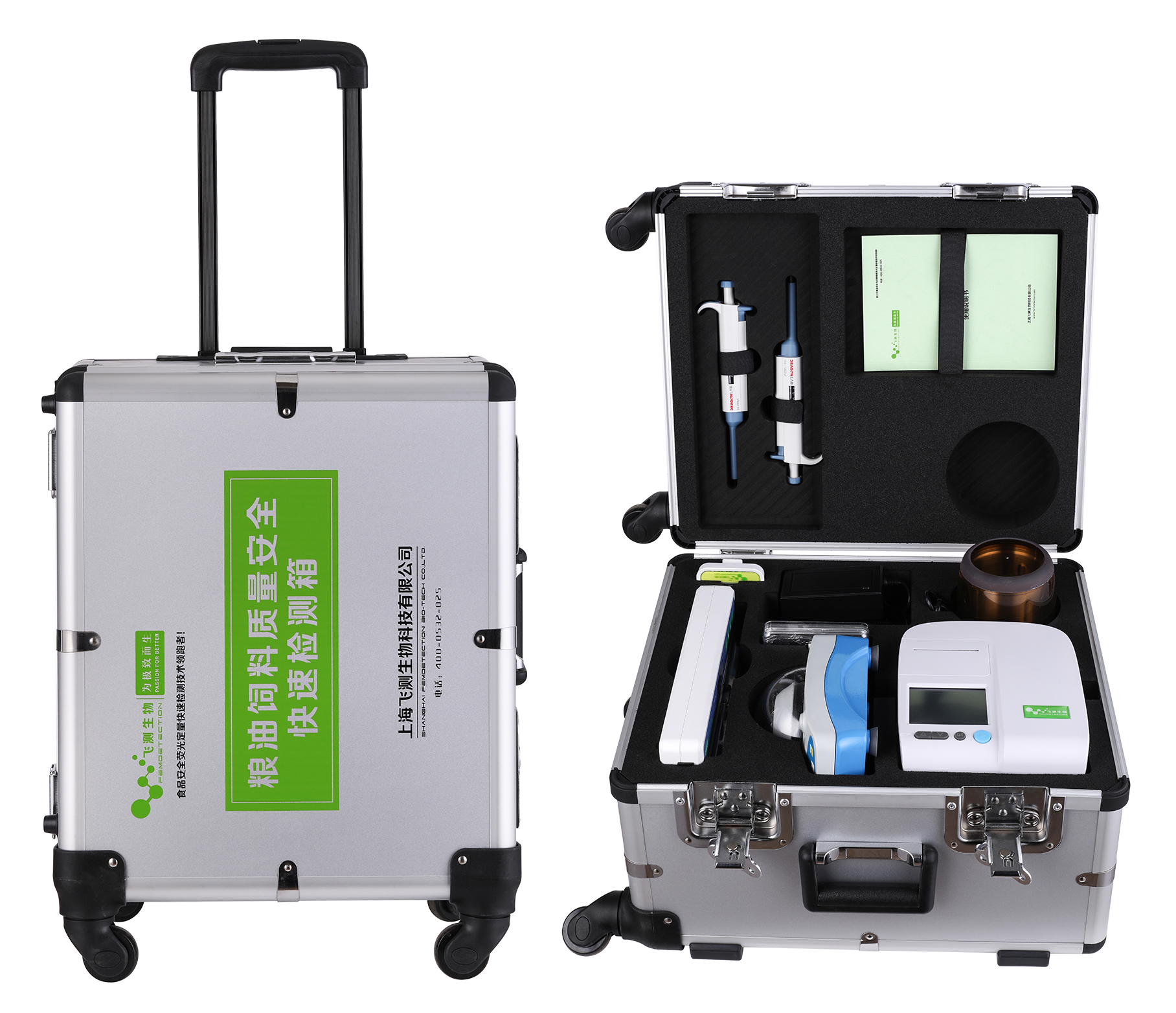 主要功能和特點:為方便外出檢測和現(xiàn)場檢測,快檢箱中配置齊全樣品前處理和檢測所需的設備和耗材,箱體配有帶滾輪和拉桿,方便攜帶,外觀精美,牢固耐用,檢測項目不僅包括黃曲霉毒素、玉米赤霉烯酮、嘔吐毒素、赭曲霉毒素A、伏馬菌素、T2毒素等真菌毒素,還可檢測重金屬、農(nóng)藥殘留、轉基因等項目。檢測結果可現(xiàn)場打印,也可通過GPRS實時傳送到溯源管理云平臺,實現(xiàn)檢測結果的自動分析、全過程質(zhì)量控制、檢測數(shù)據(jù)共享、溯源管理、大數(shù)據(jù)分析等功能,為糧油質(zhì)量安全的快速現(xiàn)場檢測提供了一種全新的技術手段,真正的糧油飼料質(zhì)量安全移動快速檢測實驗室。